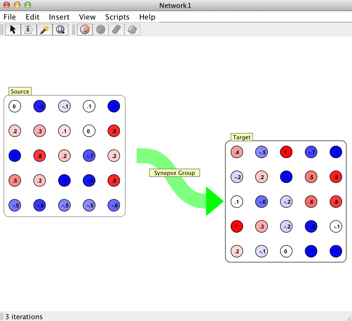 Note: For very large synapse groups (> ~10,000) it is not advisable to make each indvidiual synapse visible. In such cases the connectivity structure is obscured by the sheer number of synapses, and worse, the GUI may become slow or unresponsive (depending on the machine and how many synapses are being made visible at once).