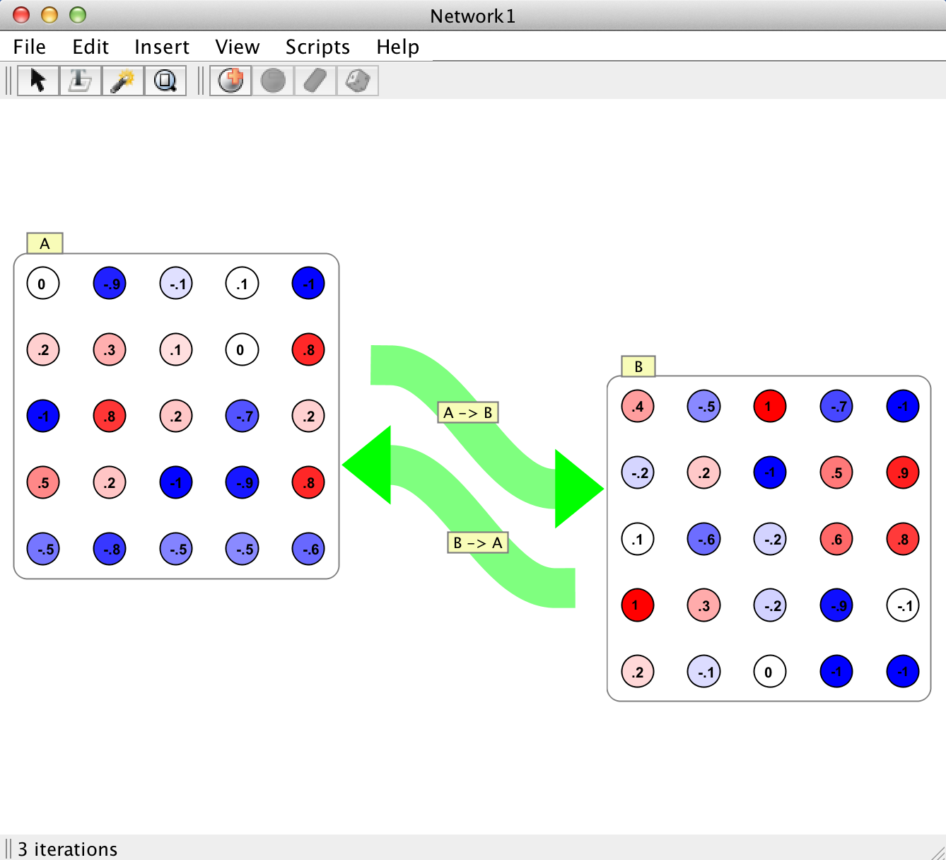 Pictured here is an example of all the different visualizations of synapse groups a user may encounter in Simbrain. Although there are different visualizations for unidirectional, bidirectional, and recurrent synapse groups, it is important to note that fundamentally they all represent the same underlying construct.