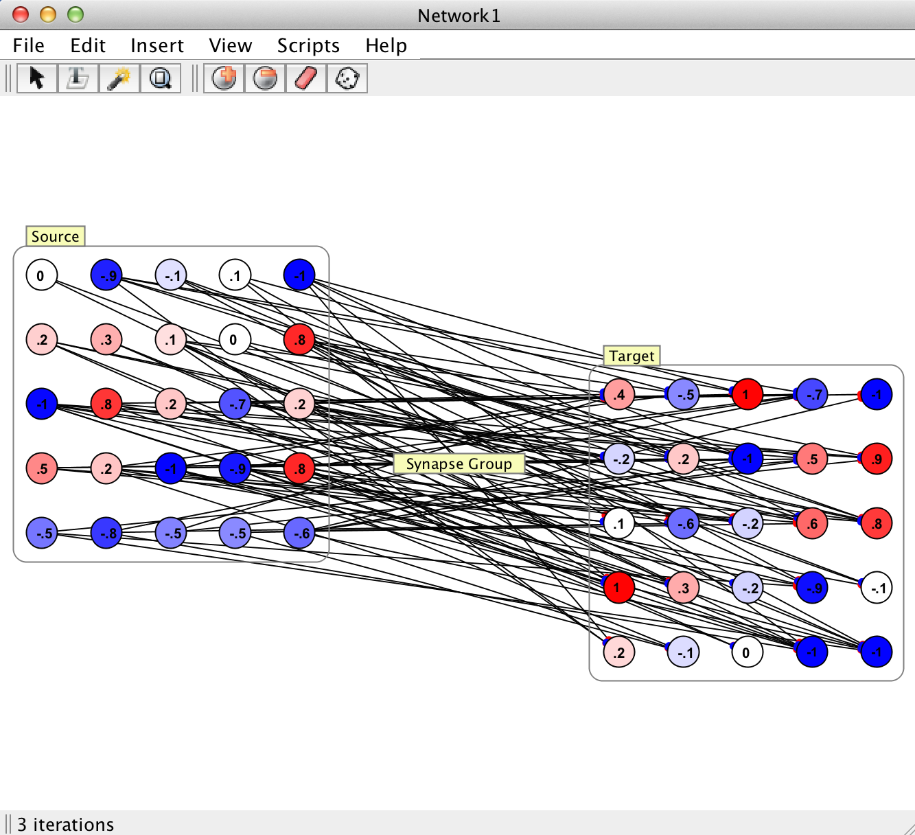 To manually create a synapse group, select the source neuron group by its interaction box, designate it as a source neuron group (either by pressing "1" or invoking the set as source menu command), and then select a target neuron group by selecting it, and invoke the synapse creation dialog (either by pressing "2" or invoking the Connect Neuron Group with Synapse Group command). Cf the quick 1 2 method for neurons. The same thing works when manually connecting neuron groups with synapse groups.