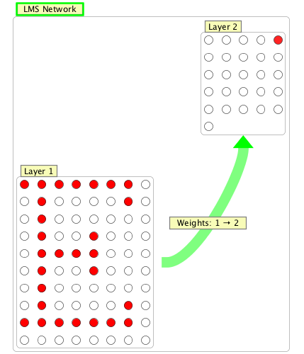 The LMS (or "least mean squares") Network is a classic type of two layer feed-forward network that implements the LMS or Delta rule for learning. The LMS rule is a form of supervised learning, which means that the user supplies desired input to output mappings. In the network shown on the right (available as a workspace called "lmsLetters.zip") letter patterns have been trained to produce labelled outputs. The network can generalize beyond the inputs it was trained on to recognize letters similar to those in its training set.