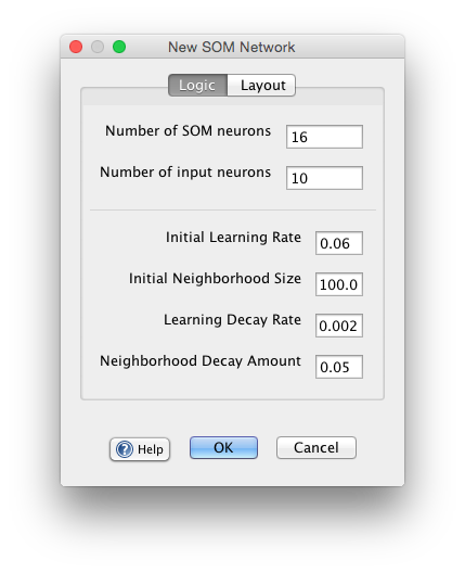 When the training dialog is used inputs can be specified in the input tab, and then the play button pressed until the learning rate and neighborhood size go to 0. Parameters controlling the rate at which these decay can be adjusted and learning re-run to try to achieved a desired result.