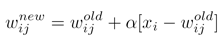 Where i and j are the dimensions of the weight matrix w, and x is the input vector.2. Update the winning neuron and the neurons in it's update neighborhood: