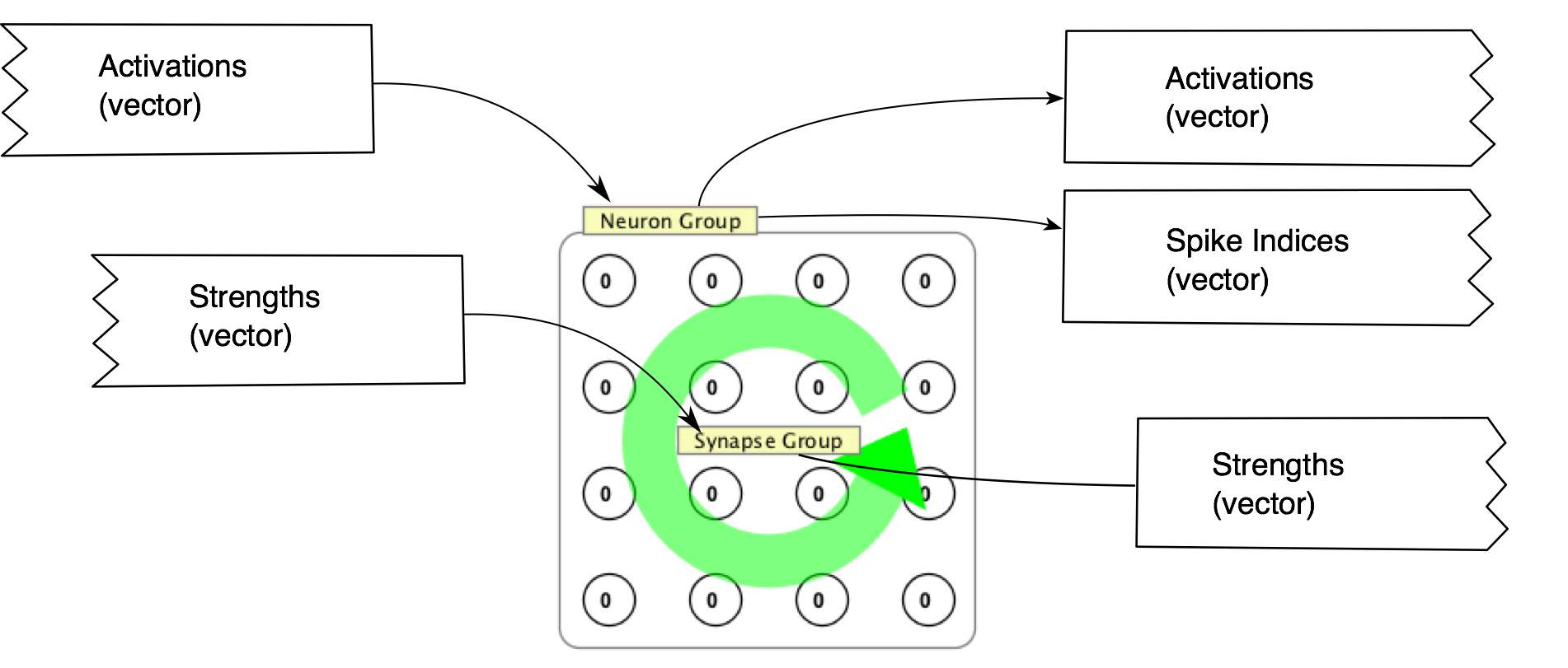 Neuron groups consume vector activations from elsewhere in a simulation (e.g a table), and produce vectors of activations or spike indices to send elsewhere in a simulation (e.g. to a chart). Similarly with synapse groups.