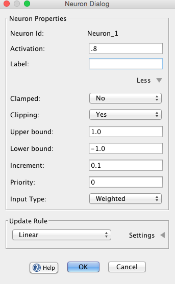 More detailed adjustments parameters can be adjusted using the neuron dialog. The dialog contains several sections, including a section for adjusting common neuron properties, described below, and a section specific to the neuron update rule (these parameters are discussed in the relevant sub-pages).
