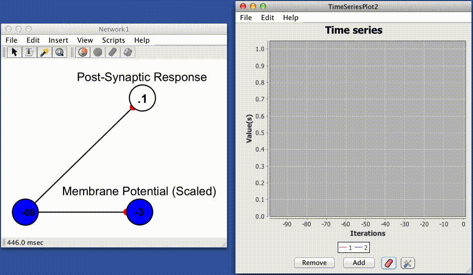 The convolved jump and decay spike responder produces a post-synaptic response (PSR) by convolving instantaneous trains of spikes (Dirac delta functions) with a simple exponential kernel. This yeilds the following equation for determining a post synaptic response based on the absolute efficacy of the synapse (strength/weight), the time since the last spike, and the current state (spiking or quiescent) of the pre-synaptic cell.