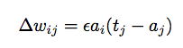 The LMS rule works as follows. The change in a weight is equal to the product of a learning rate ε, the pre-synaptic source activation, and the difference between the post-synaptic activation aj and a desired activation tj. The error is the difference between the desired and actual activation of the target neuron.