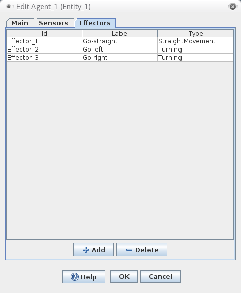 To display an agent's effectors, double click on the agent in Odor World and select the effectors tab. The effector panel lists all of an agent's effectors along with its effector type and label. Labels can be renamed by double clicking on the label column.