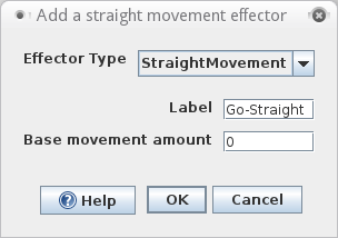 A straight effector moves the agent straight forward in Odor World. As long as the neuron coupled with the effector is active, the agent will continue to try to move directly forward in Odor World. The distance that the agent moves per time step is the product of the activation in the neuron and the base movement amount.