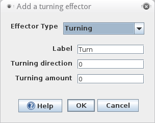 This effector controls changes in an agent's heading. When a turning effector is activated, the turning direction and amount are multiplied and the product is added to the agent's current heading. By default left and right turning effectors are provided. If a new turning effector is added it is up to the user to make the label match what the effector does.